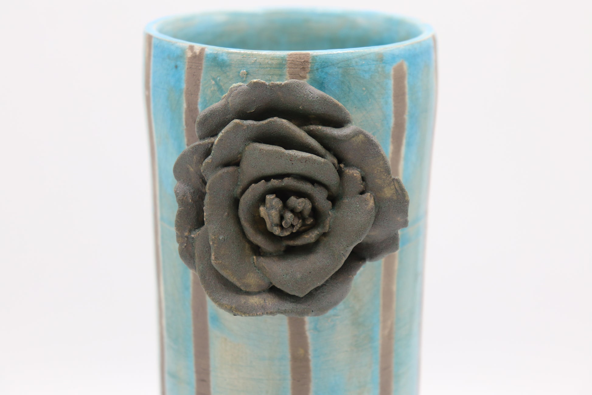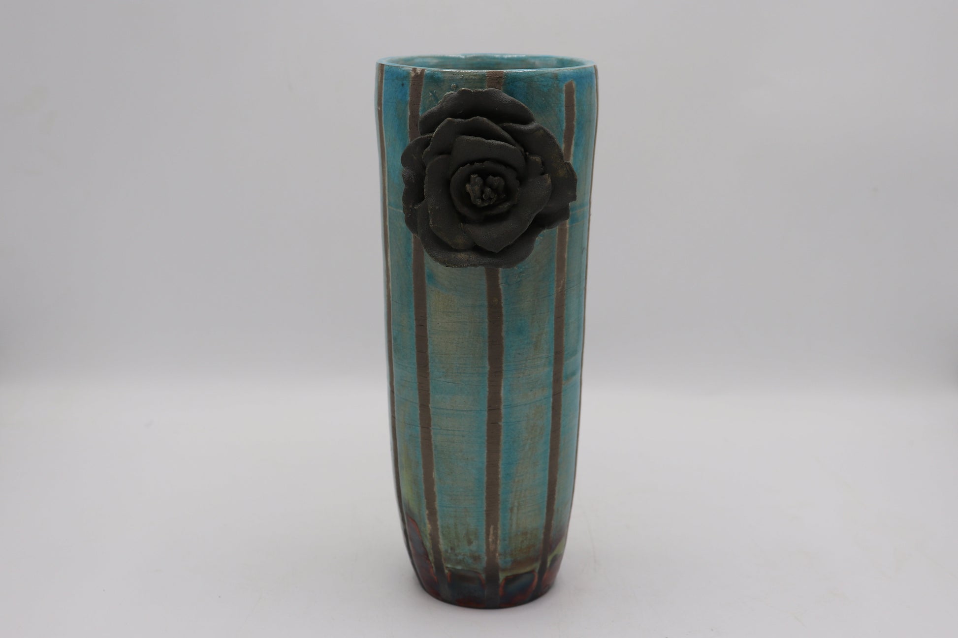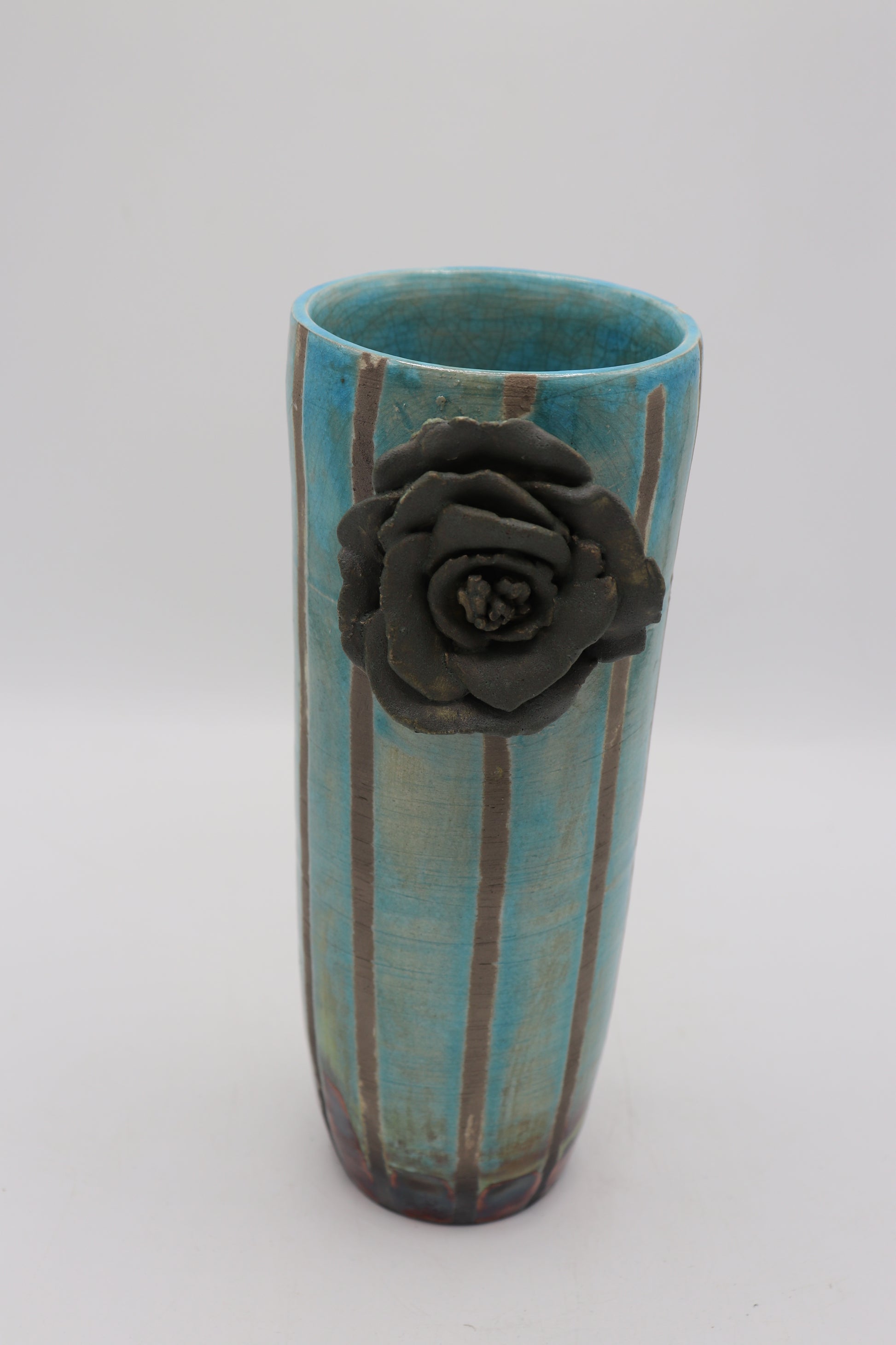 Raku ceramic vase made from white Raku clay and turquoise and peacock matte Raku glaze.